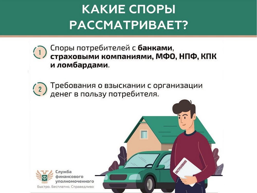 Финансовый уполномоченный решает имущественные (например, денежные) споры без суда между финансовыми организациями и их клиентами – физическими лицами. Это обязательный порядок решения споров по закону. Не нужно терять время и деньги на экспертизы и юристов. Вся процедура бесплатная: от приема обращения до принятия решения. Ваши обращения финансовый уполномоченный рассматривает 15 рабочих дней (по спорам, связанным с неправомерным переводом пенсионных накоплений, – 20 рабочих дней) – без вашего визита. Никуда не нужно ходить. Решение финансового уполномоченного обязательно для исполнения финансовой организацией. Вы можете подать обращение в отношении страховой компании, банка, микрофинансовой организации, негосударственного пенсионного фонда, ломбарда и кредитного потребительского кооператива. Проверьте свой спор на официальном сайте финансового уполномоченного finombudsman.ru: подлежит ли он рассмотрению финансовым уполномоченным? Это можно сделать, ответив всего на несколько простых вопросов. Перед подачей обращения финансовому уполномоченному – направьте заявление о восстановлении нарушенного права (претензию) в финансовую организацию, с которой у вас возник имущественный (например, денежный) спор. Если спор с финансовой организацией не урегулирован – подайте обращение финансовому уполномоченному на его официальном сайте или через МФЦ Кемеровской области. Более подробную информацию вы можете получить здесь.