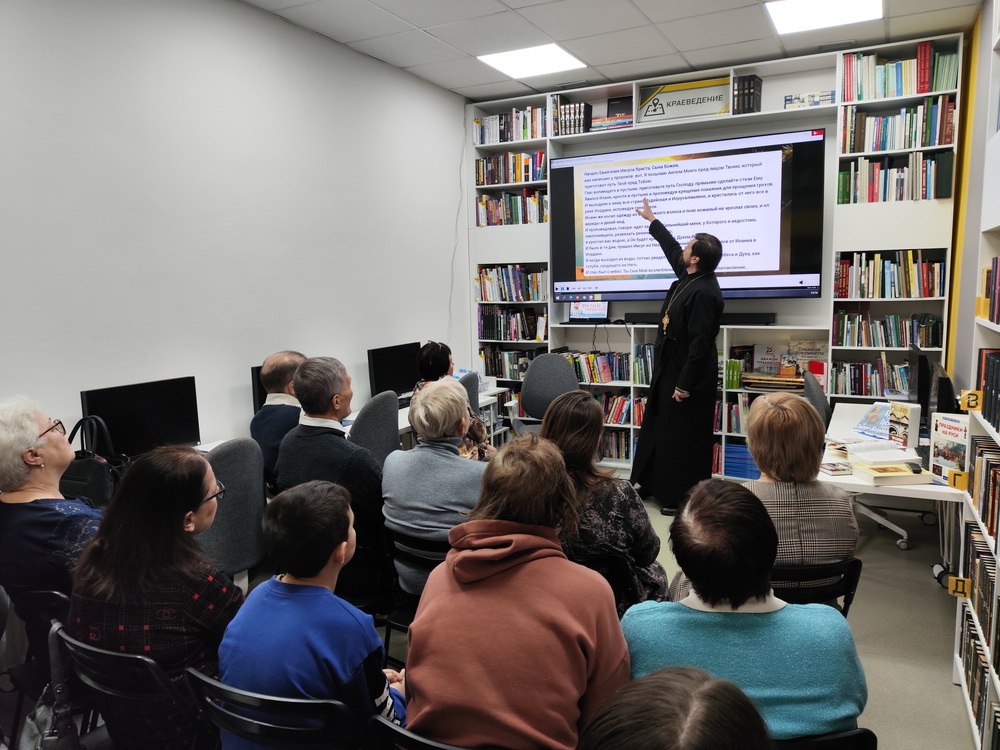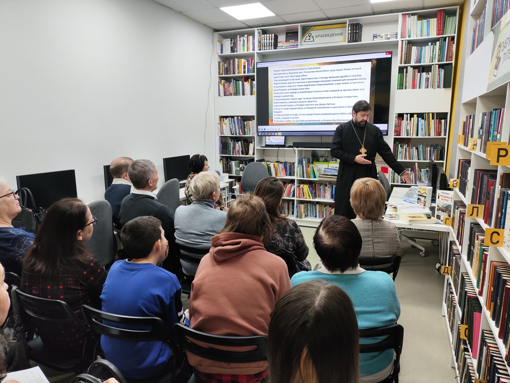 17 января 2026 года в библиотеке «Книжная радуга» (ул. Новогодняя, 2) состоялось первое заседание литературного библейского дискуссионного клуба «Иверский». Встреча приурочена к православному празднику Крещения Господня и посвящена теме «Что такое верность?». Настоятель храма Иверской иконы Божией Матери – протоиерей Сергей Алексеевич Семиков рассказал о Священном Писании – Библии. Каждый знаком с книгой, но не всякий читал ее и тем более не все могут понять осмысленно, что в ней изложено. Изучать послания нужно постепенно и вдумчиво и именно тогда раскроется истинный смысл и пути Господни. Для визуализации образа Сергей Алексеевич подготовил для гостей встречи видеофрагмент «Евангелия вслух», это популярный видеопроект на телеканале «Спас», суть которого заключается в том, что послания зачитают знаменитые актеры, телеведущие. Сегодня темой для беседы и обсуждения стало послание от Марка глава 1, которое в видеофрагменте зачитал телеведущий Андрей Малахов. Основой для дискуссии стали таинство Крещения, роль крестных родителей и смысл принятия этого обряда в осознанном возрасте. Участники также обсудили интересный исторический факт: на Руси крестили лишь трижды в год – на Рождество, Крещение и Пасху. Приглашаем всех желающих на следующую встречу клуба «Иверский», которая состоится 31 января. Тема для обсуждения: «О честном труде». Библиотека семейного чтения «Книжная радуга», тел.: 69-26-93.