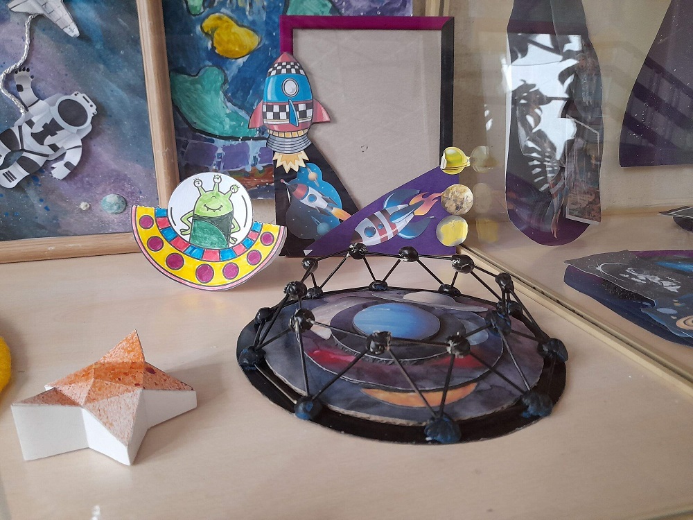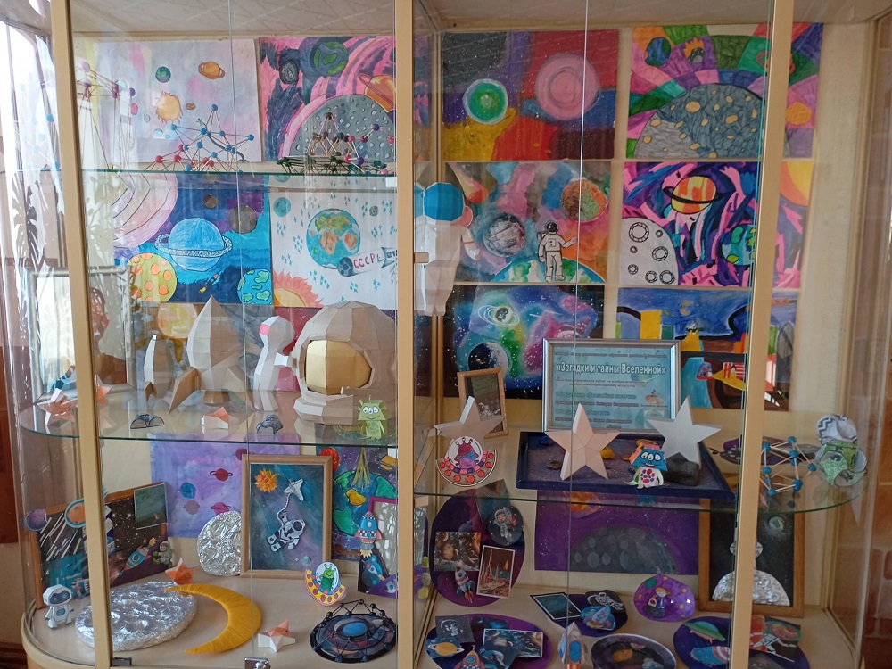В Детской библиотеке им. А. М. Береснева поселилась выставка «Загадки и тайны Вселенной». Яркие работы юных художников из студий «Волшебная кисточка» и «Гексагон» заставляли замедлить шаг и задуматься о бесконечности космоса.